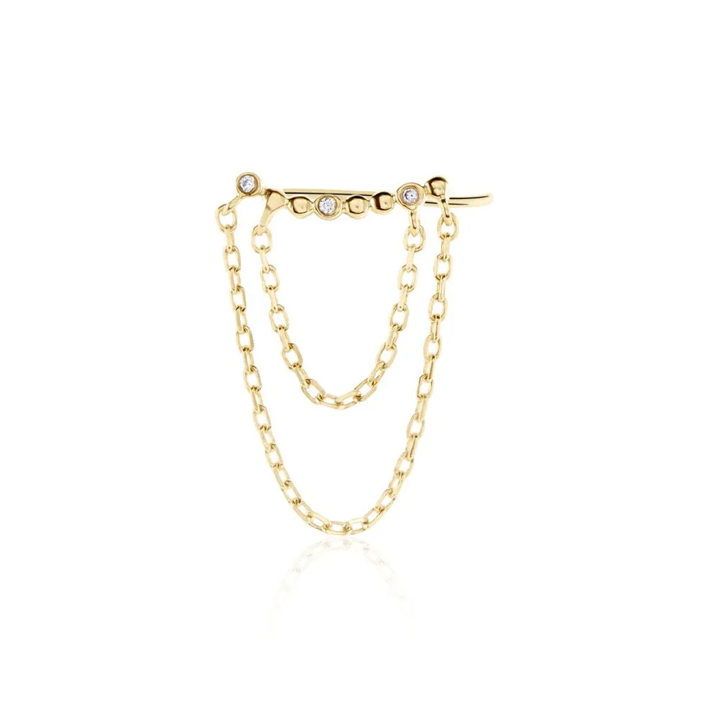 Bijou D’oreille Unitaire Plaqué Or Jaune Barrette Oxydes De Zirconium Double Chaînes Forçat