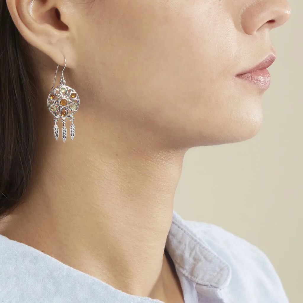 Boucles D’oreilles Argent Blanc 925/1000 Motifs Attrape Reve Ambre Cognac/miel