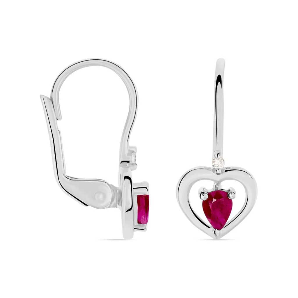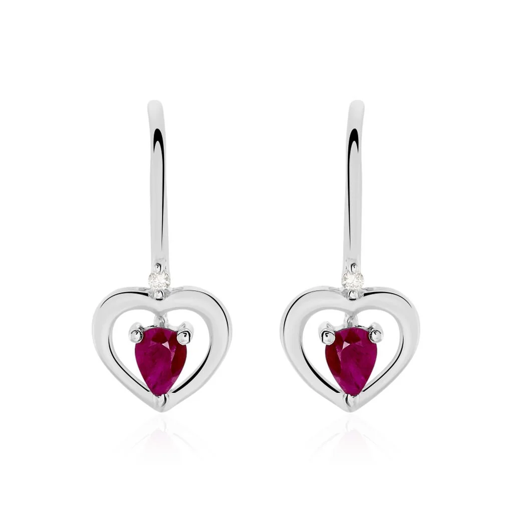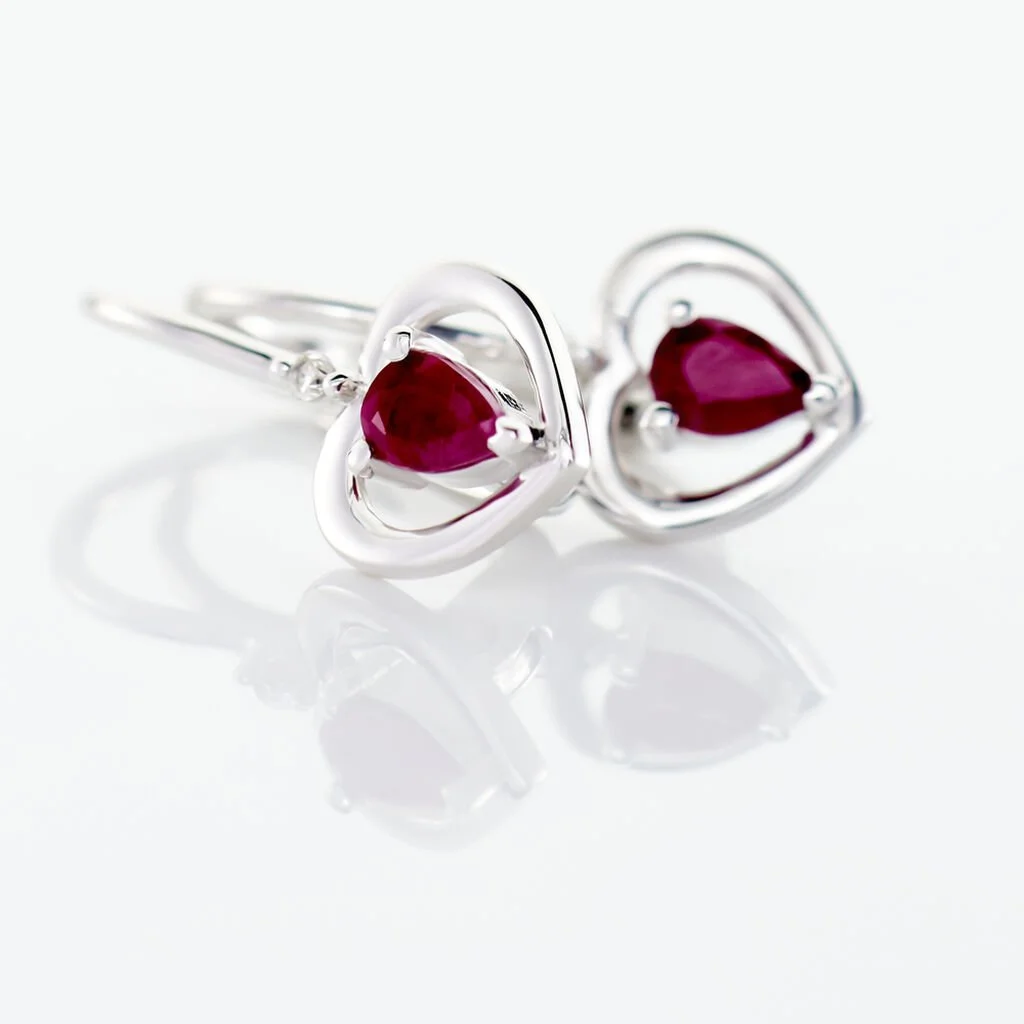 Boucles D’oreilles Pendantes Or Blanc 375/1000 Dormeuses Formes Cœurs Rubis 0.44cts