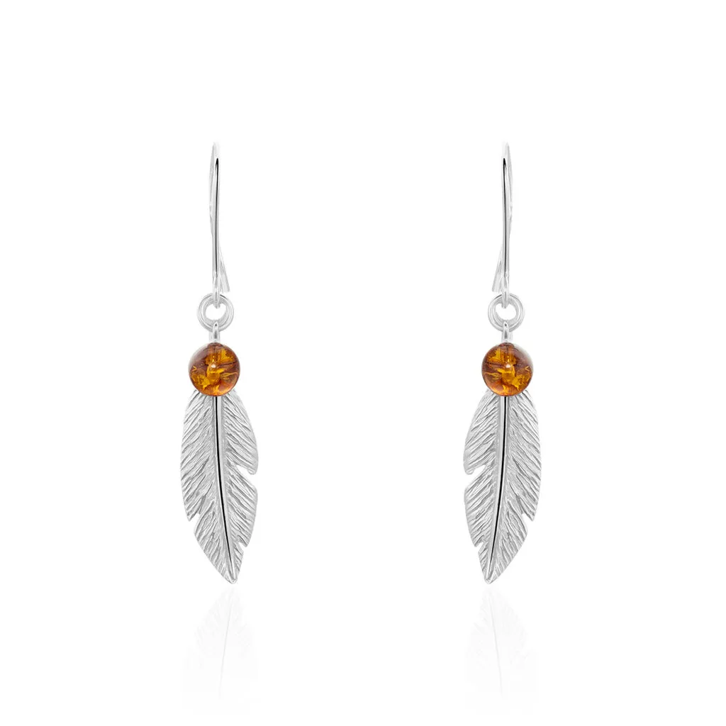 Boucles D’oreilles Pendantes Argent Blanc 925/1000 Motifs Plumes Et Pampilles Boules Ambres
