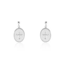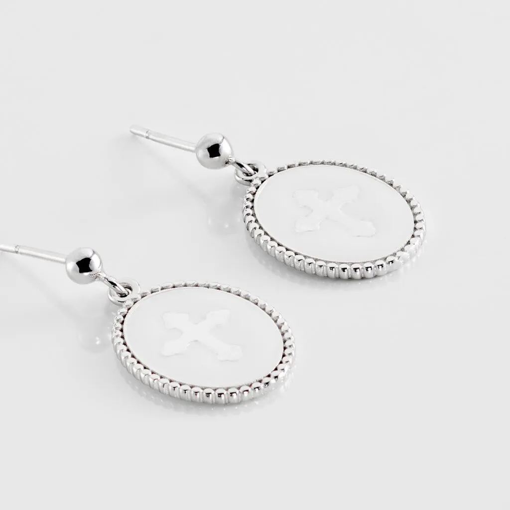Boucles D’oreilles Pendantes Argent 925/1000 Pastilles Ovales Perlees Email Blanc Et Croix