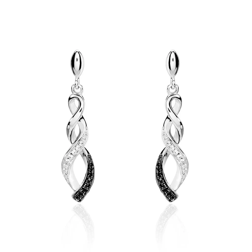Boucles D’oreilles Pendantes Argent Blanc 925/1000 Vagues Entrelacees Oxydes De Zirconium Noirs Et Blancs