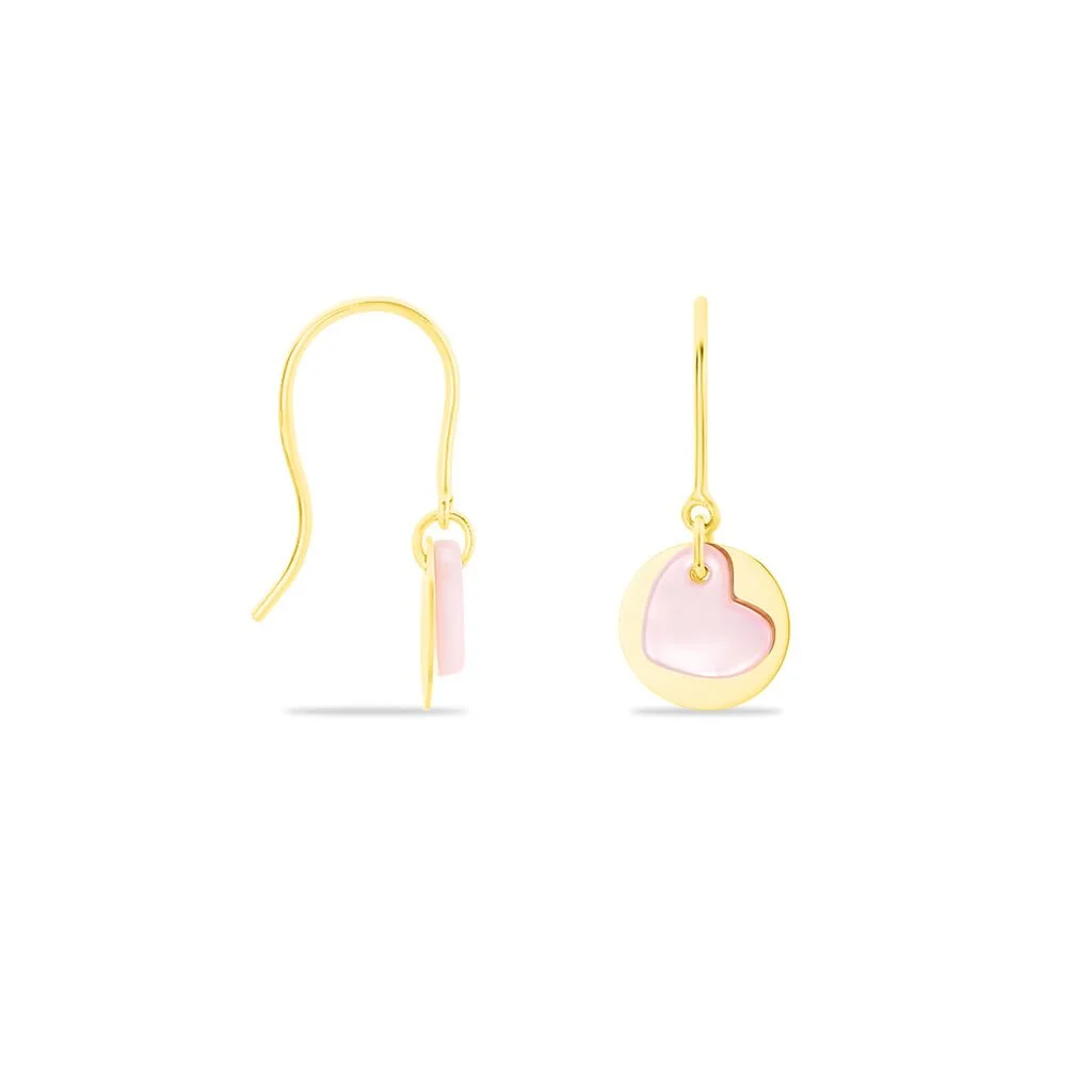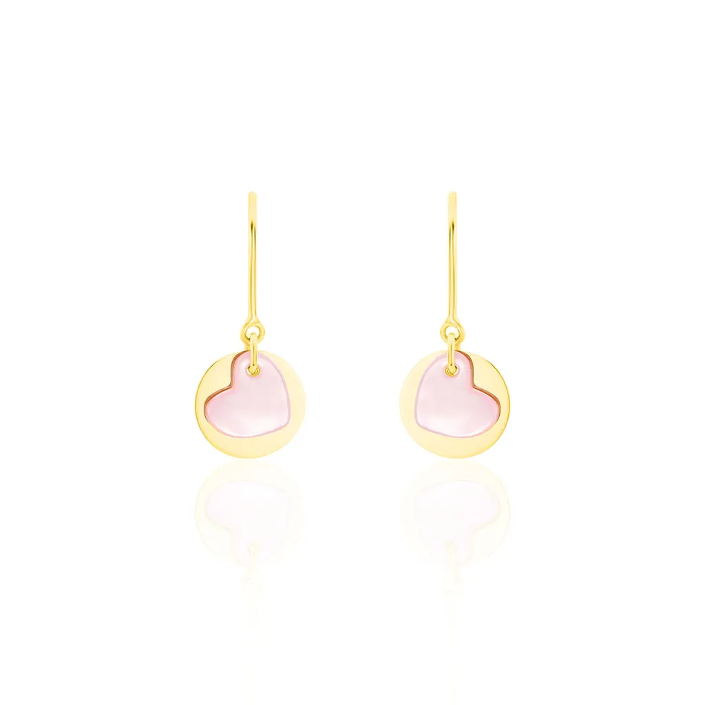 Boucles D’oreilles Or Jaune 375/1000 Pendantes Pastilles + Motifs Cœurs Pendants Nacre Rose