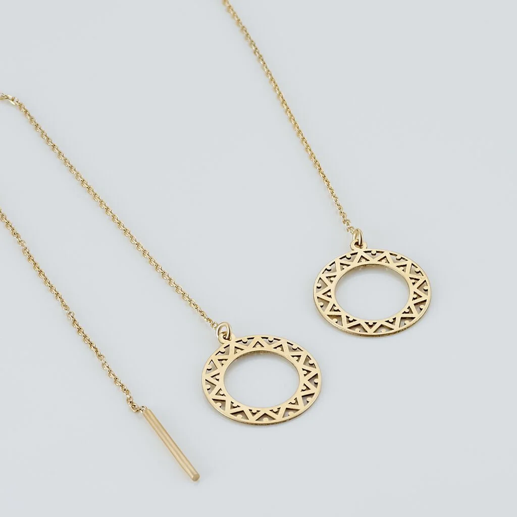 Boucles D’oreilles Or Jaune 375/1000 Double Pendantes Forme Esprit Oriental Chaine Maille Jaseron