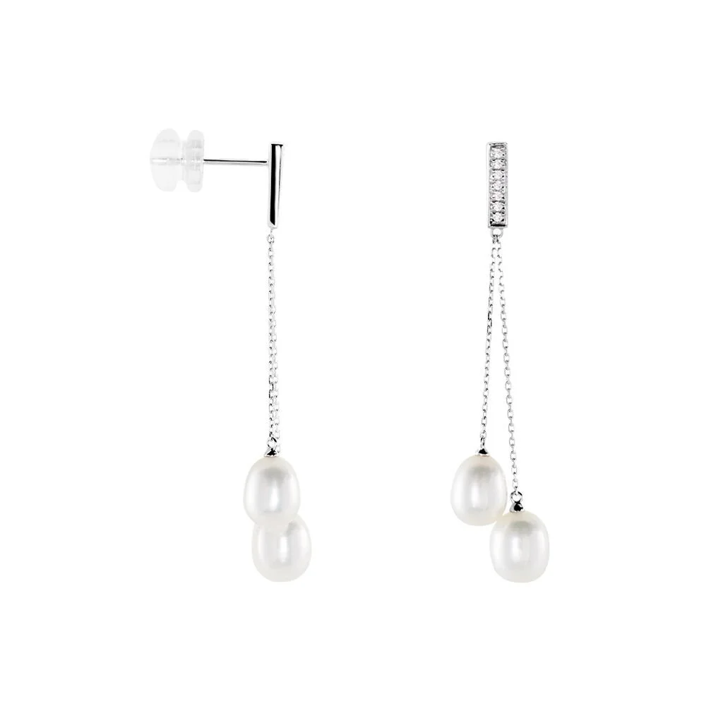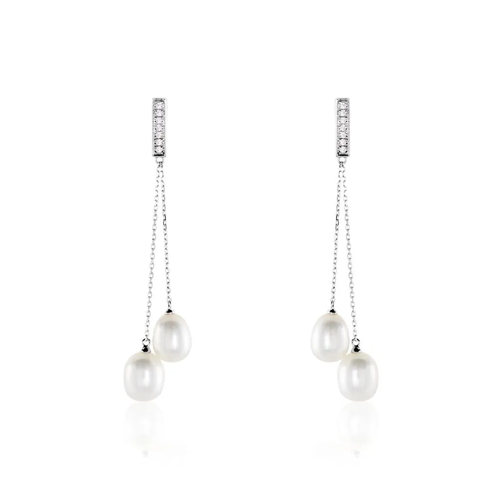 Boucles D’oreilles Pendantes Or Blanc 375/1000 2 Fils Perles De Culture 5.5/6cm Barrettes Oxyde De Zirconium