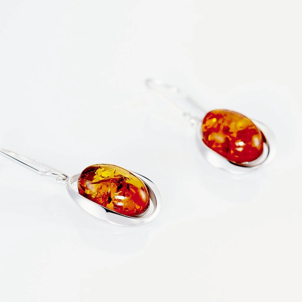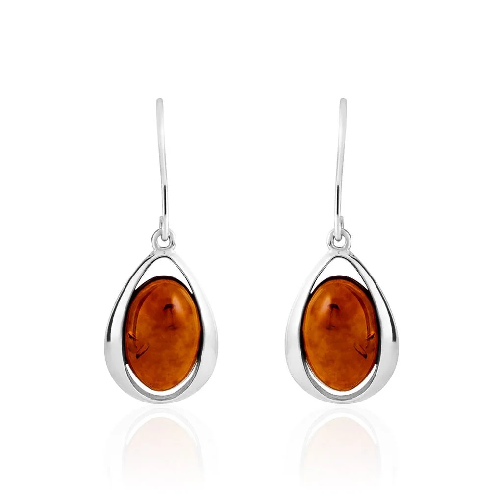 Boucles D’oreilles Argent Blanc 925/1000 Formes Gouttes Ambre Cognac