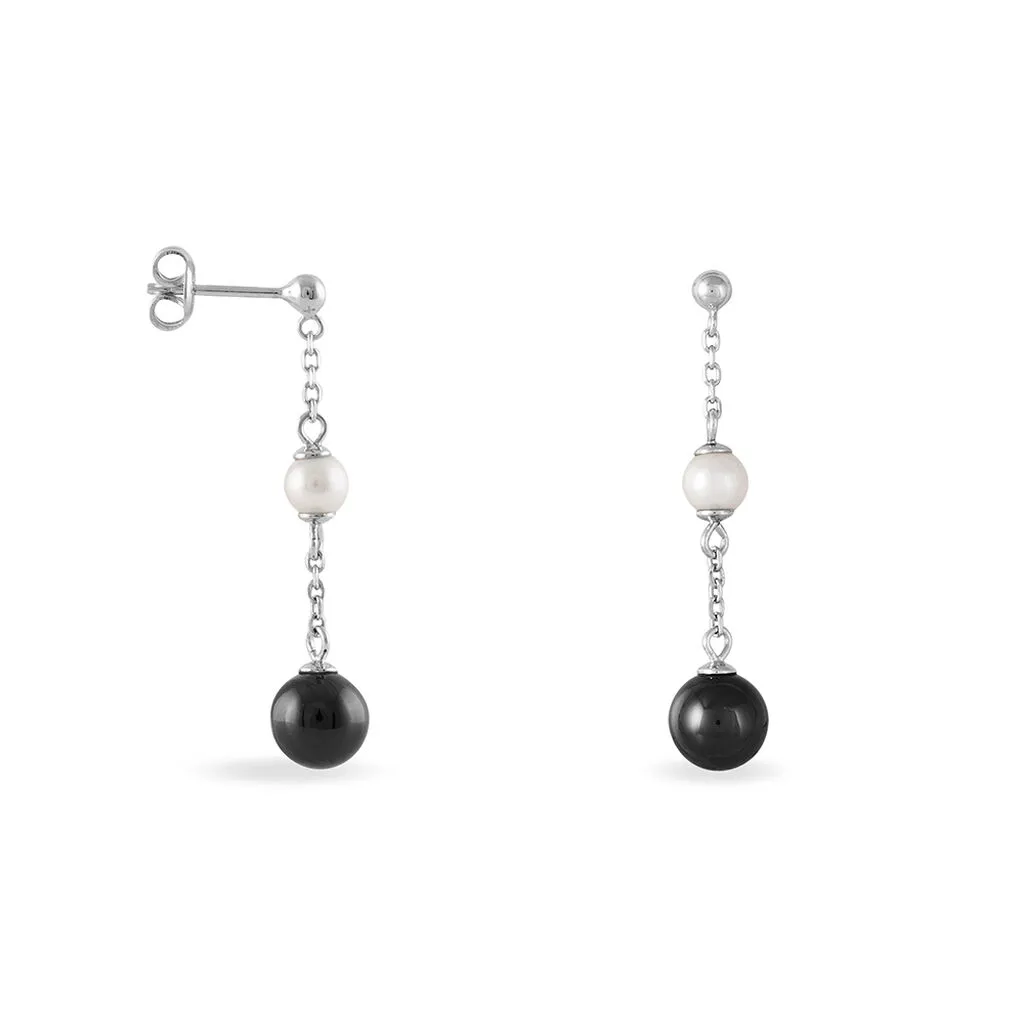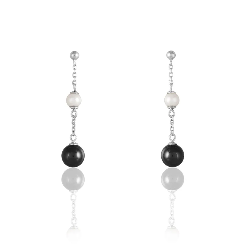 Boucles D’oreilles Pendantes Argent Blanc 925/1000 Mailles Forcats Perles De Culture Et Boules Ceramique Noire