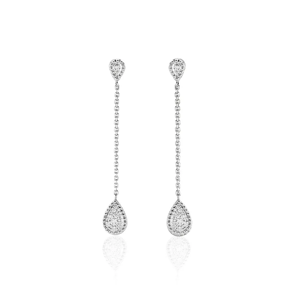 Boucles D’oreilles Or Blanc 375/1000 Pendantes Forme Goutte Pavage Diamants