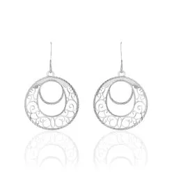 Boucles D’oreilles Pendantes Argent Blanc 925/1000 Rosaces Arabesques Ajourees Et Effets Diamantes