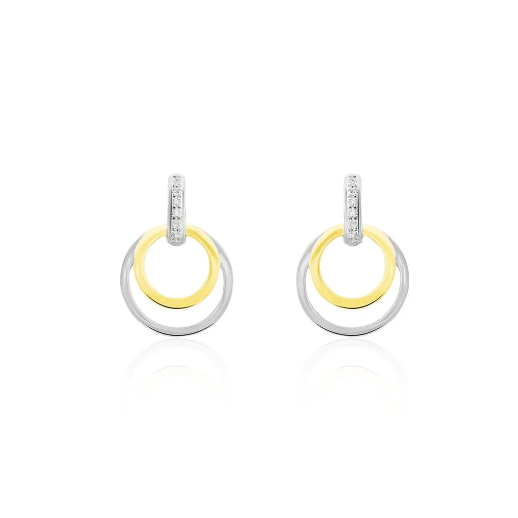 Boucles D’oreilles Pendantes Or 375/1000 Bicolore Blanc Et Jaune Doubles Cercles Ajoures Et Barrettes Pavage Diamants