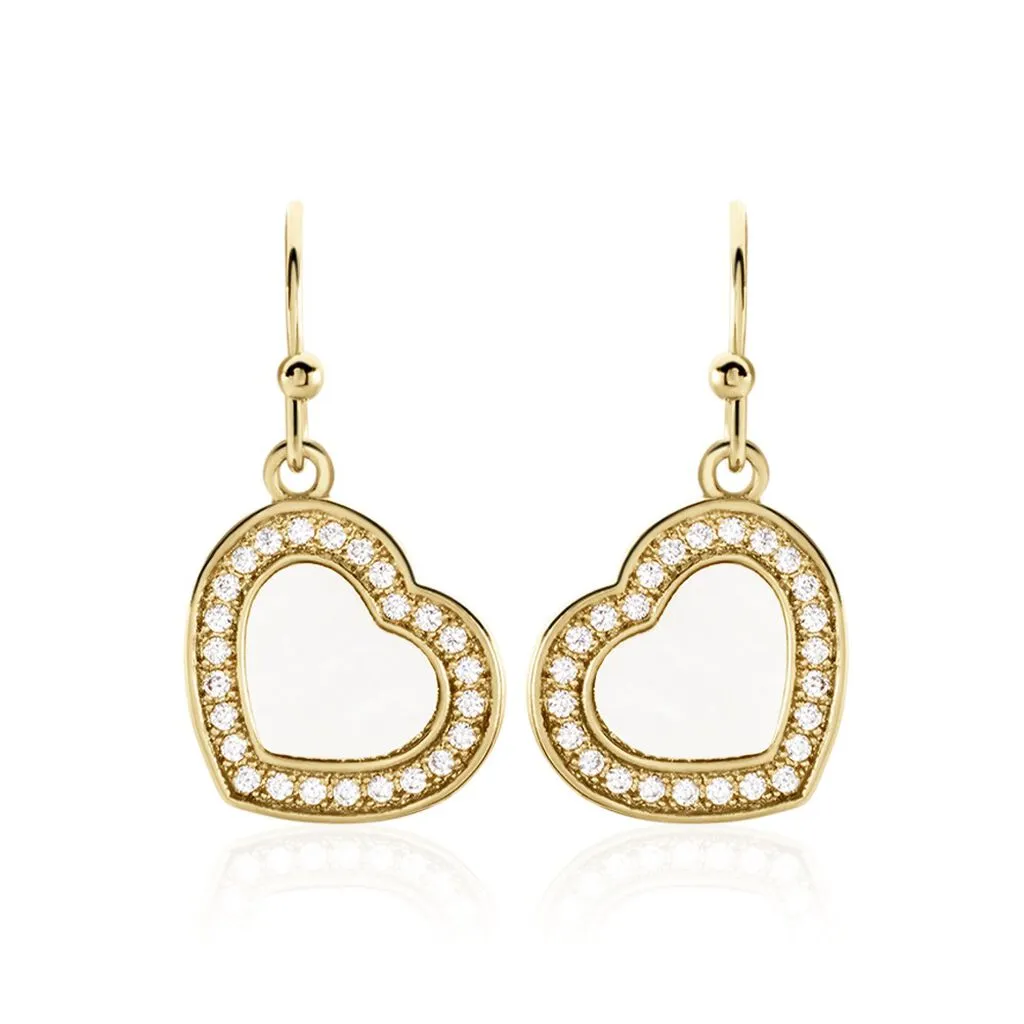 Boucles D’oreilles Pendantes Plaqué Or Jaune Cœurs Nacres Blanches Entourages Oxydes De Zirconium