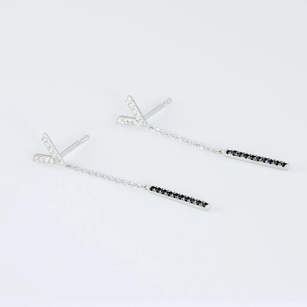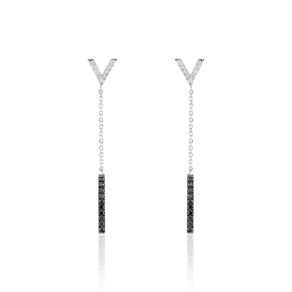 Boucles D’oreilles Or Blanc 375/1000 Formes V Pendantes Diamants Noirs Et Diamants Blancs