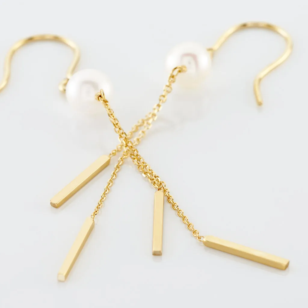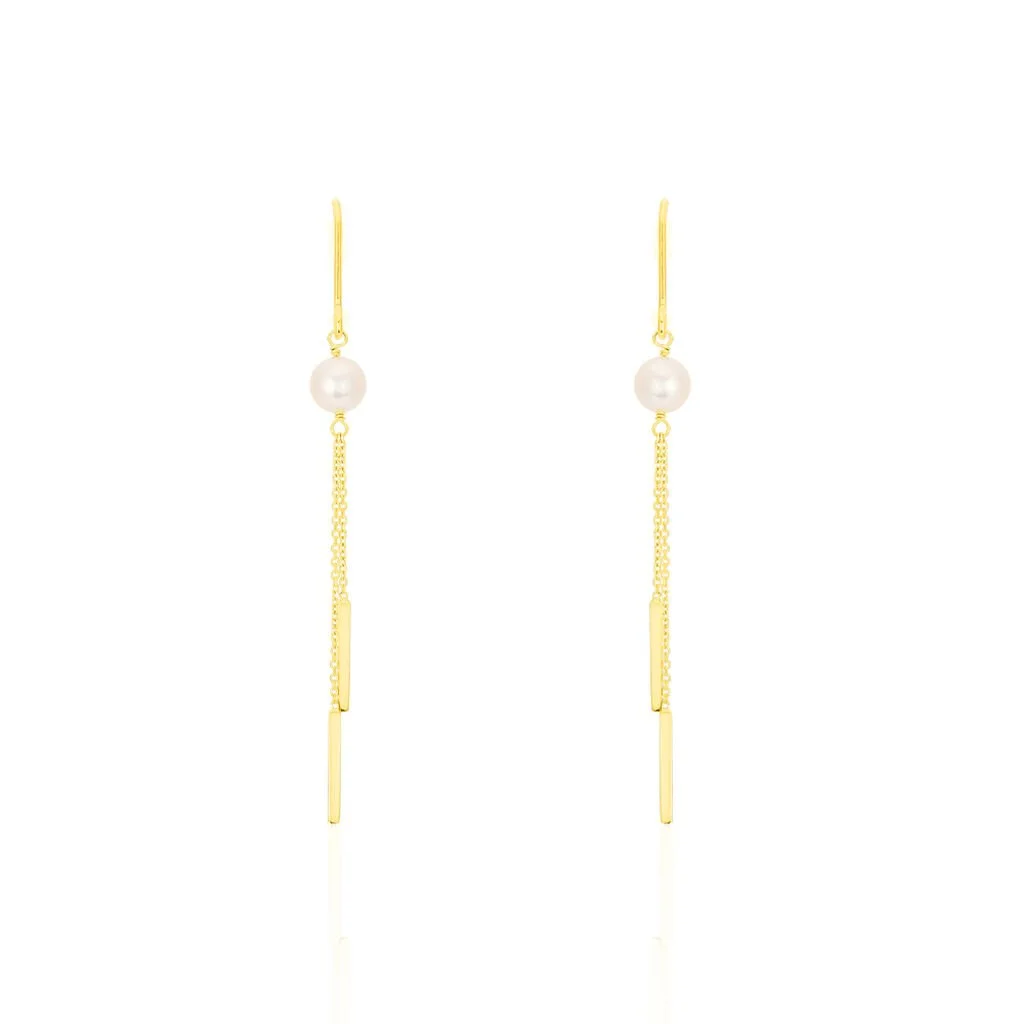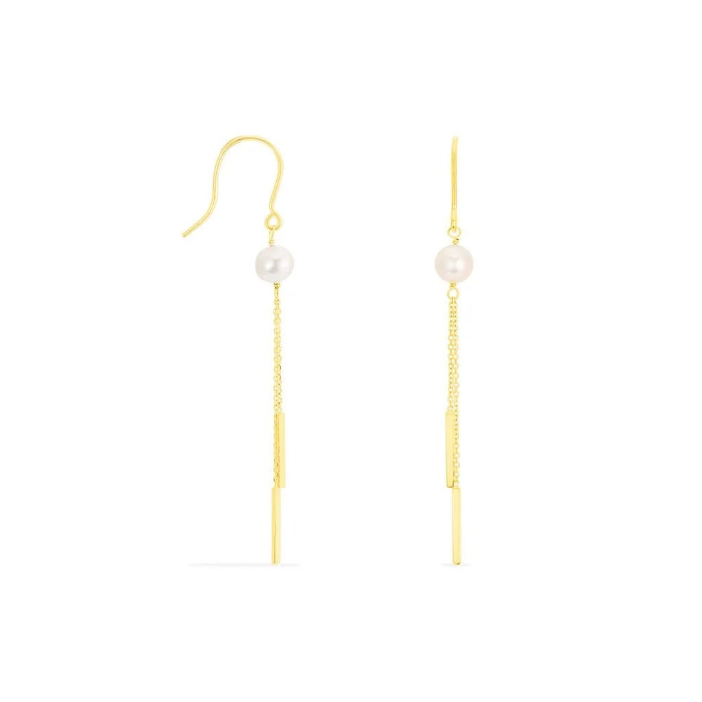 Boucles D’oreilles Or Jaune 375/1000 Motifs Barres Pendantes Et Perle De Culture