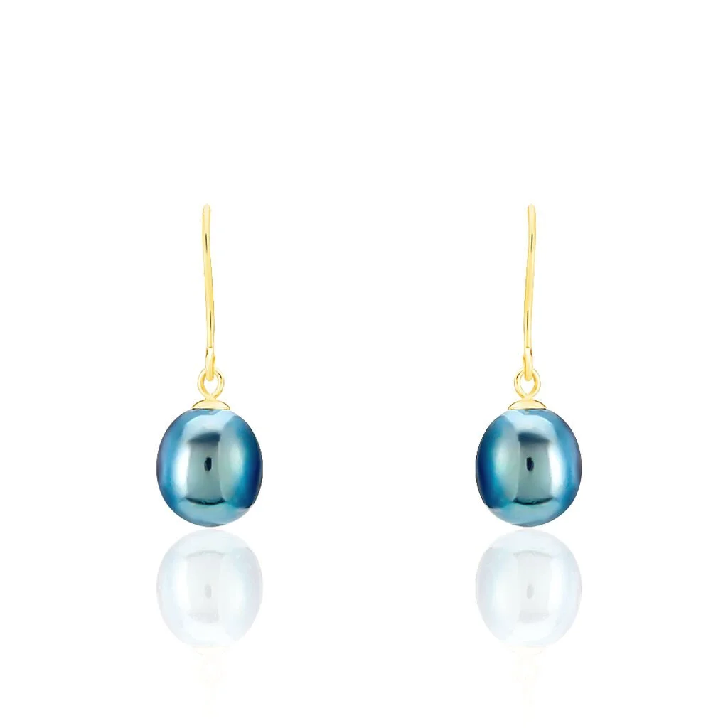 Boucles D’oreilles Pendantes Or Jaune 375/1000 Perles De Culture Nacre Noire 6.5/7mm