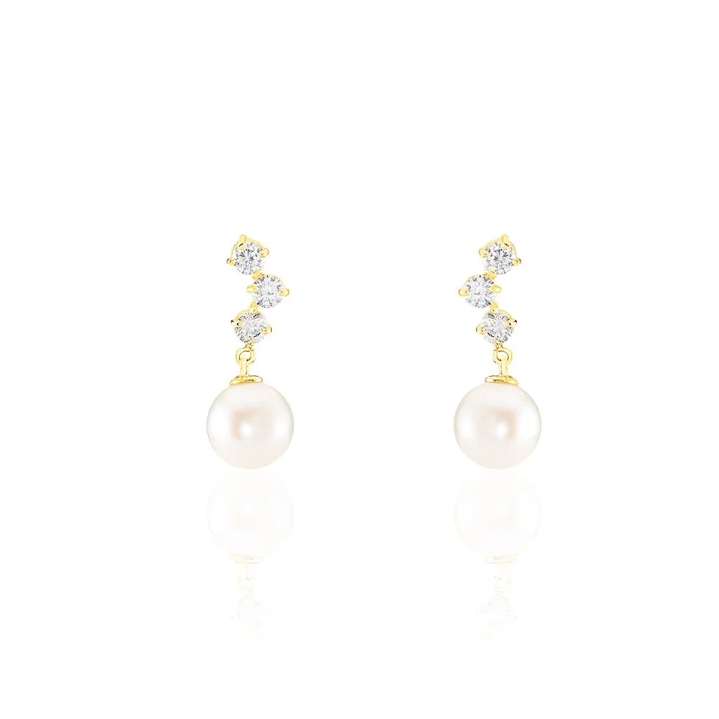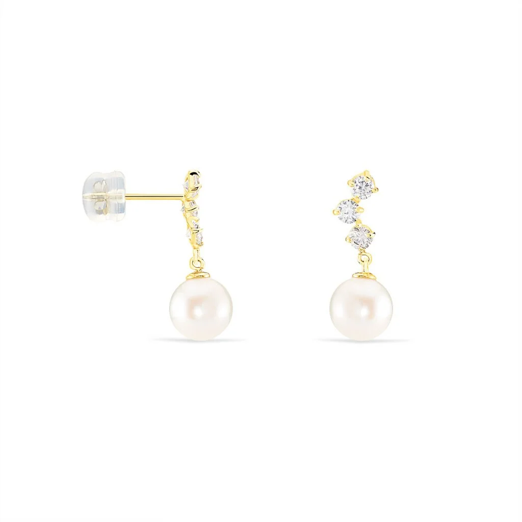 Boucles D’oreilles Or Jaune 375/1000 Pendantes Perles De Cultures Et Oxydes De Zirconium