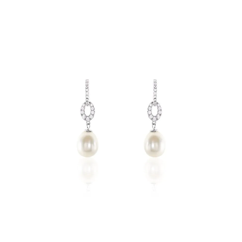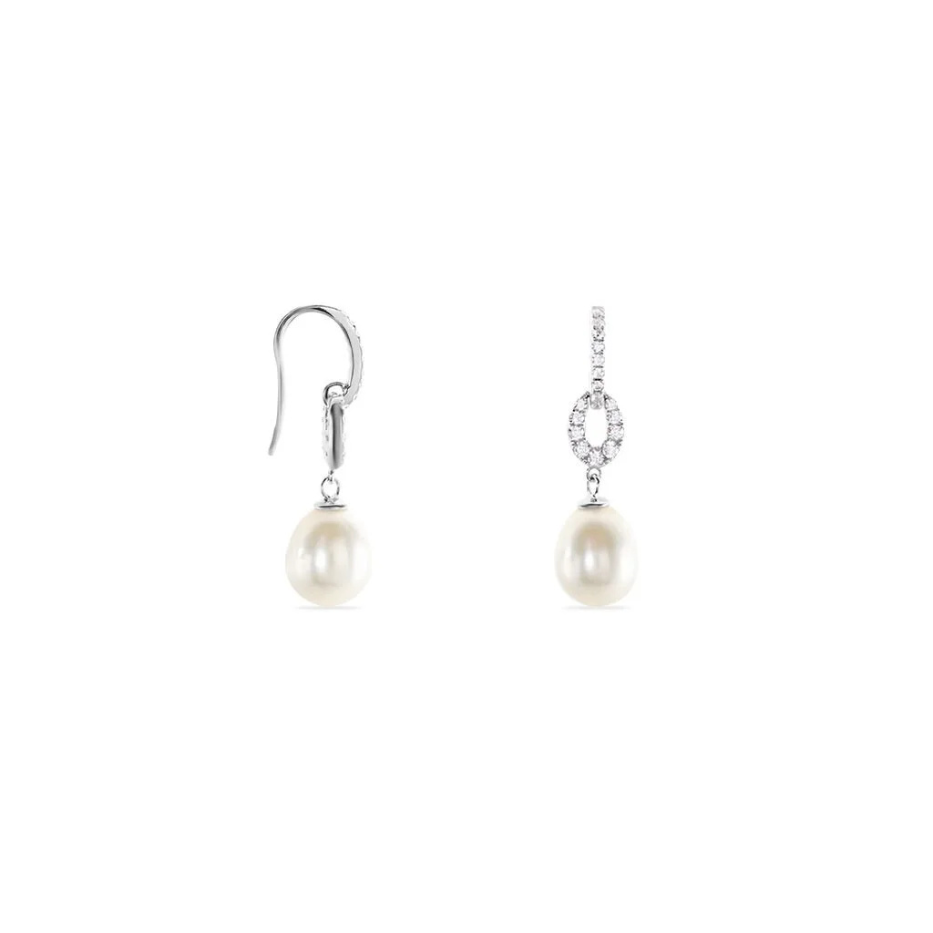 Boucles D’oreilles Argent Blanc 925/1000 Oxydes De Zirconium Anneau Ovale Perle De Culture 8.5/9mm