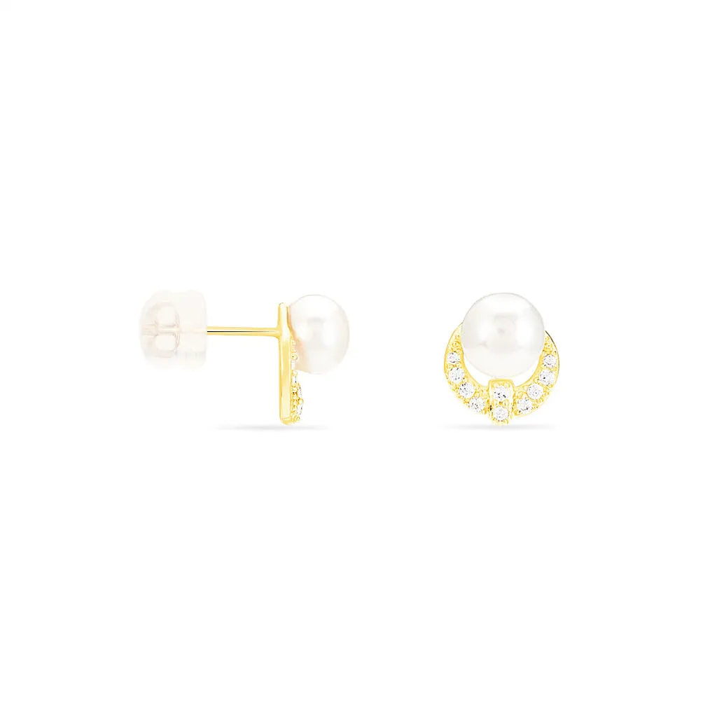Boucles D’oreilles Or Jaune 375/1000 Perles De Culture 6mm Demi Cercles Oxydes De Zirconium