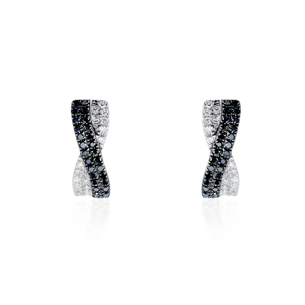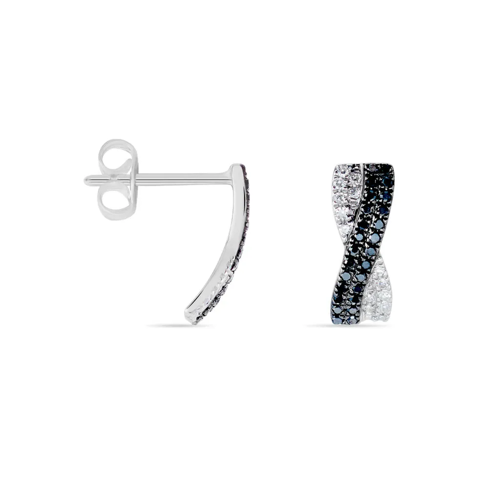 Boucles D’oreilles Or Blanc 375/1000 Pavage Diamants Noirs Et Blancs Forme Ruban