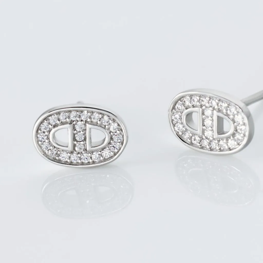Boucles D’oreilles Puces Argent Blanc 925/1000 Maillon Pavage Oxydes De Zirconium