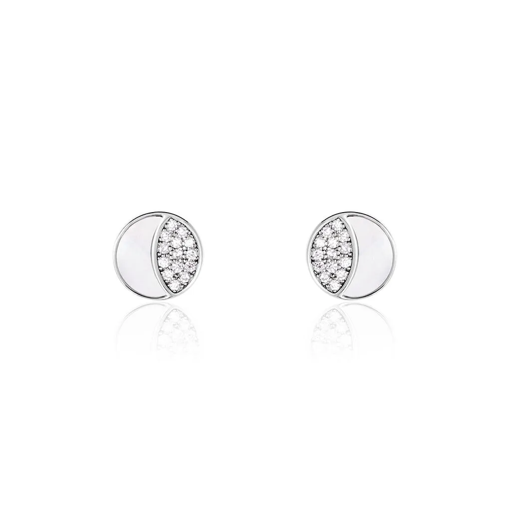 Boucles D’oreilles Puces Argent Blanc 925/1000 Lunes Nacre Pavage Oxydes De Zirconium