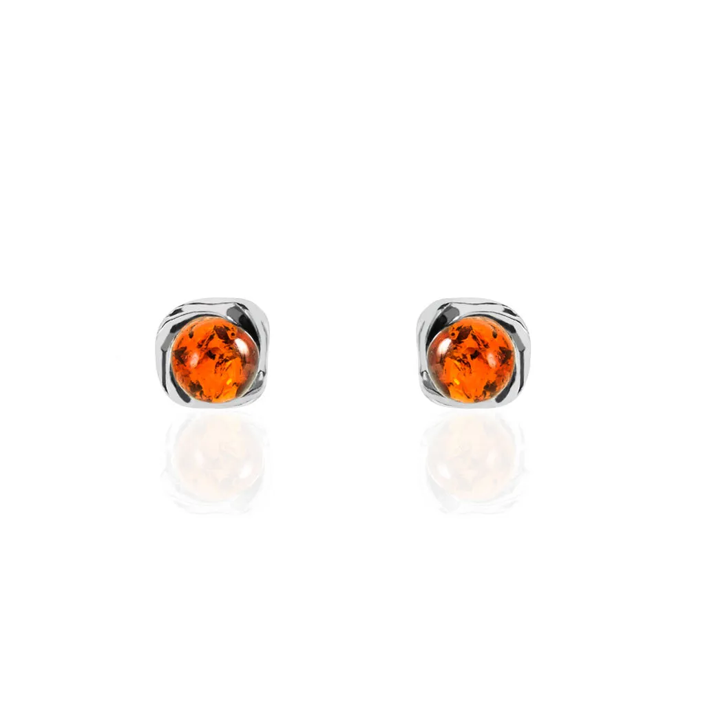 Boucles D’oreilles Puces Argent Blanc 925/1000 Boules Ambre Cognac