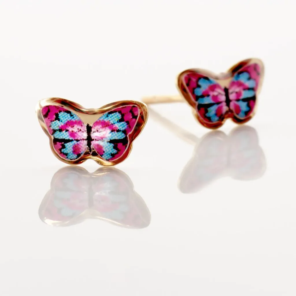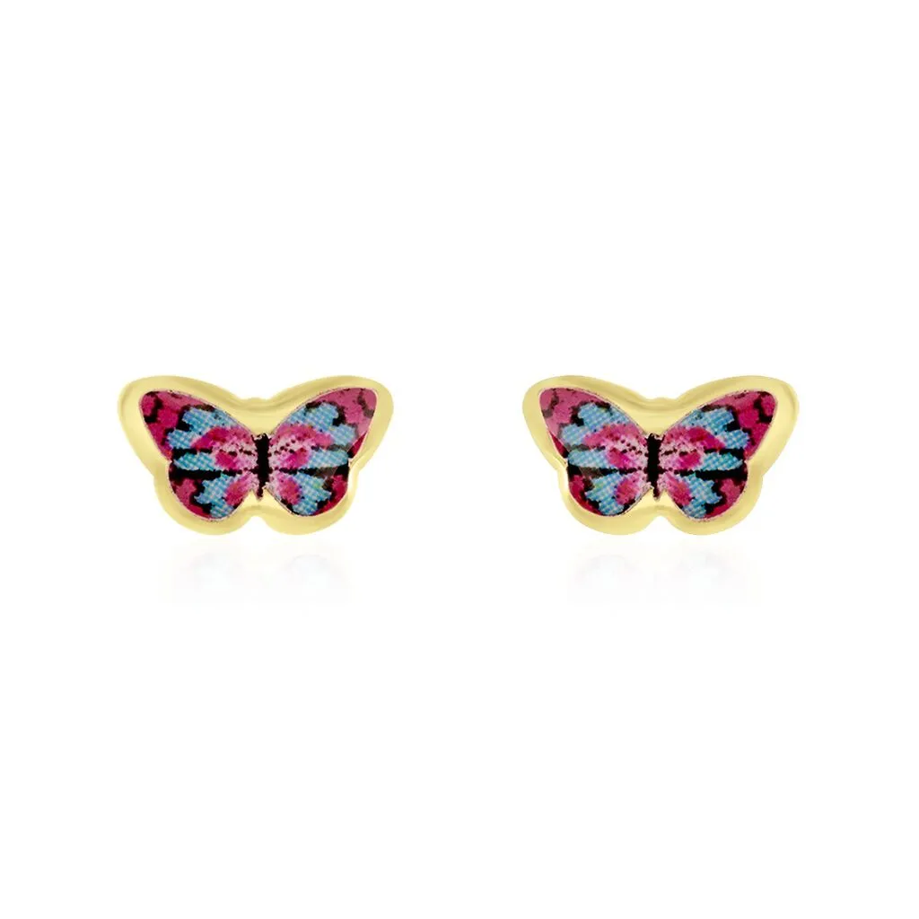 Boucles D’oreilles Or Jaune 375/1000 Puces Papillons Fushia Et Bleus