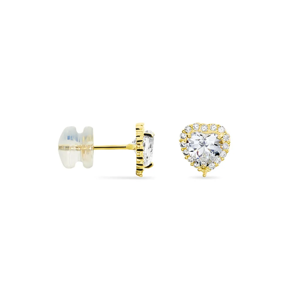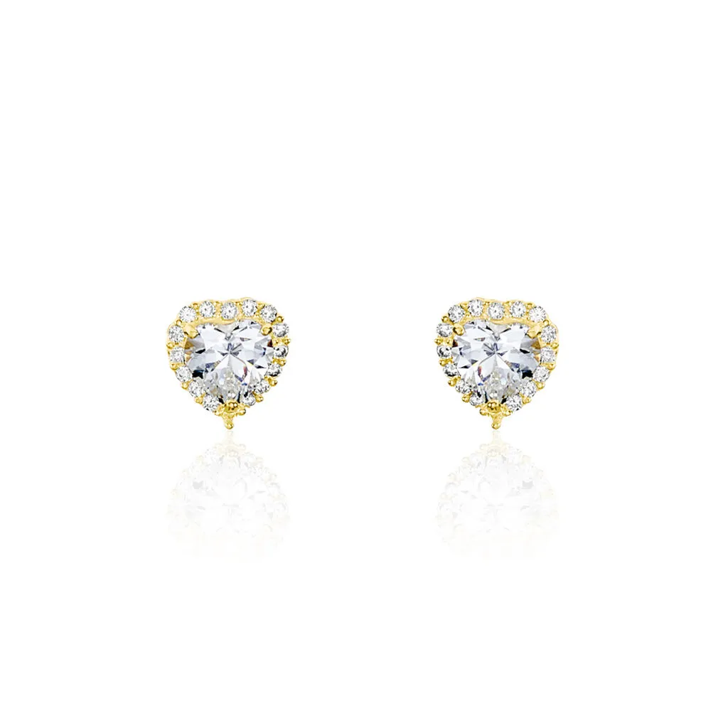 Boucles D’oreilles Or Jaune 375/1000 Puces Cœurs Oxydes De Zirconium Et Entourage Oxydes De Zirconium