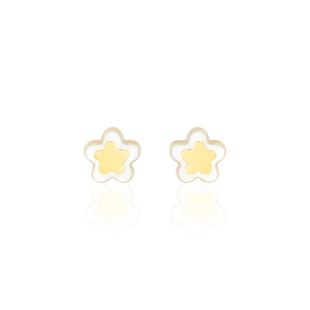 Boucles D’oreilles Or Jaune 375/1000 Puces Formes Fleurs + Motifs Fleurs Nacre Blanche