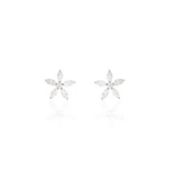 Boucles D’oreilles Or Blanc 375/1000 Puces Motif Fleurs Oxydes De Zirconium Forme Navette