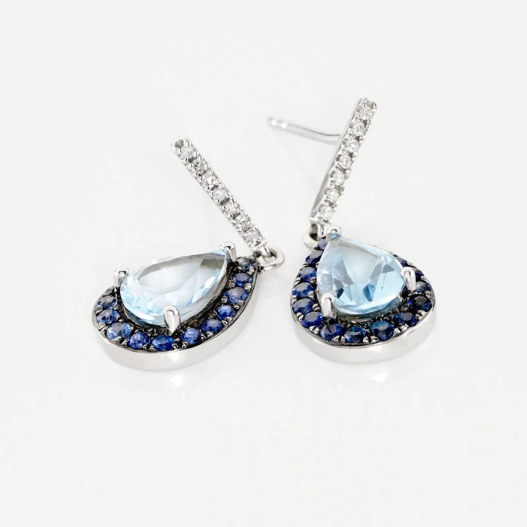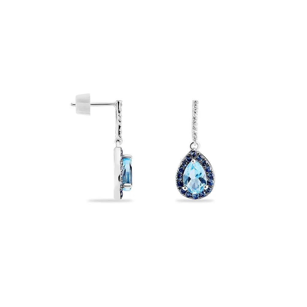 Boucles D’oreilles Or Blanc 375/1000 Topazes Forme Poires Entourage Saphirs Et Pavage Diamants