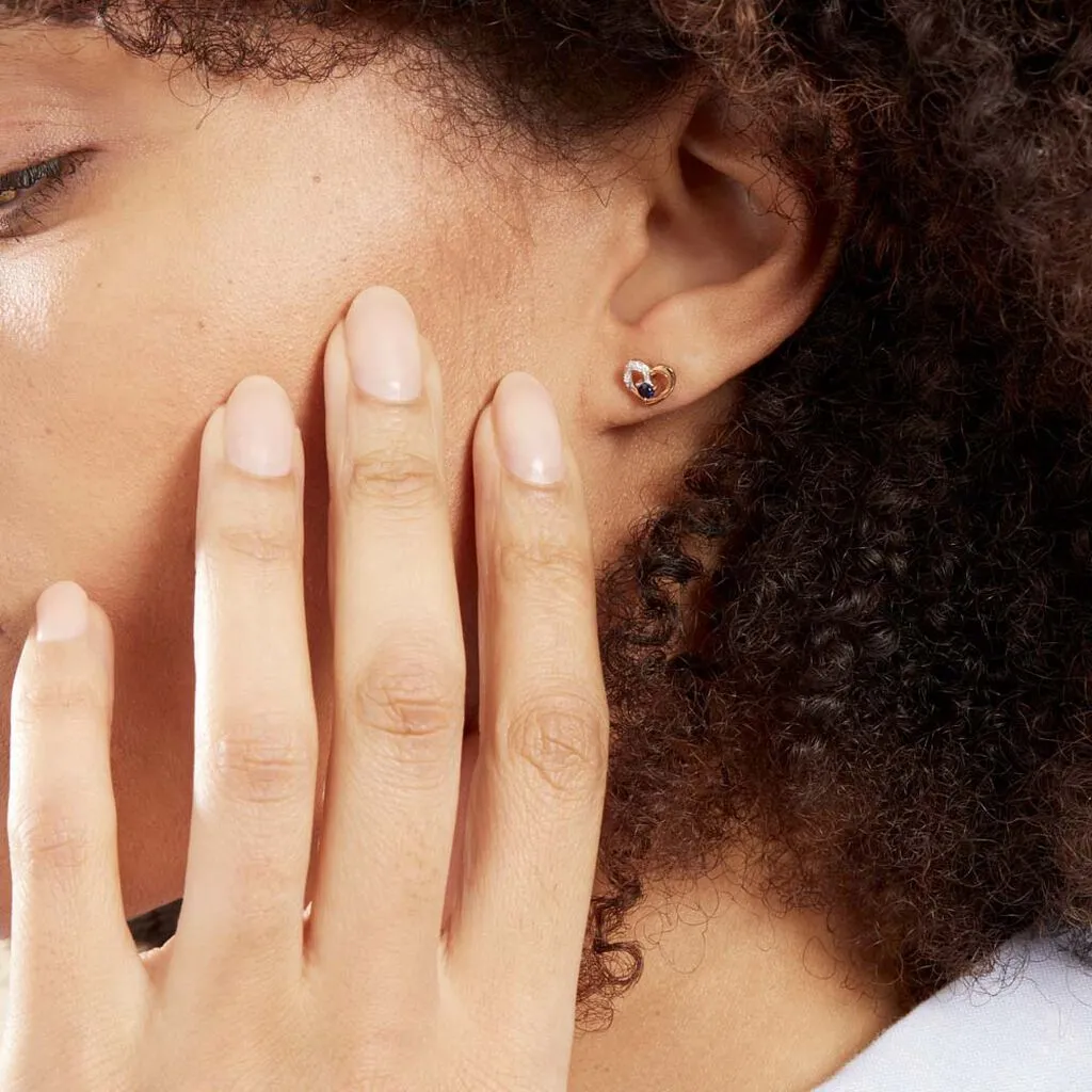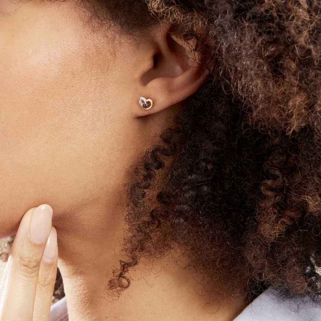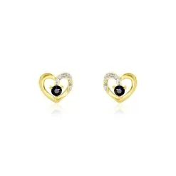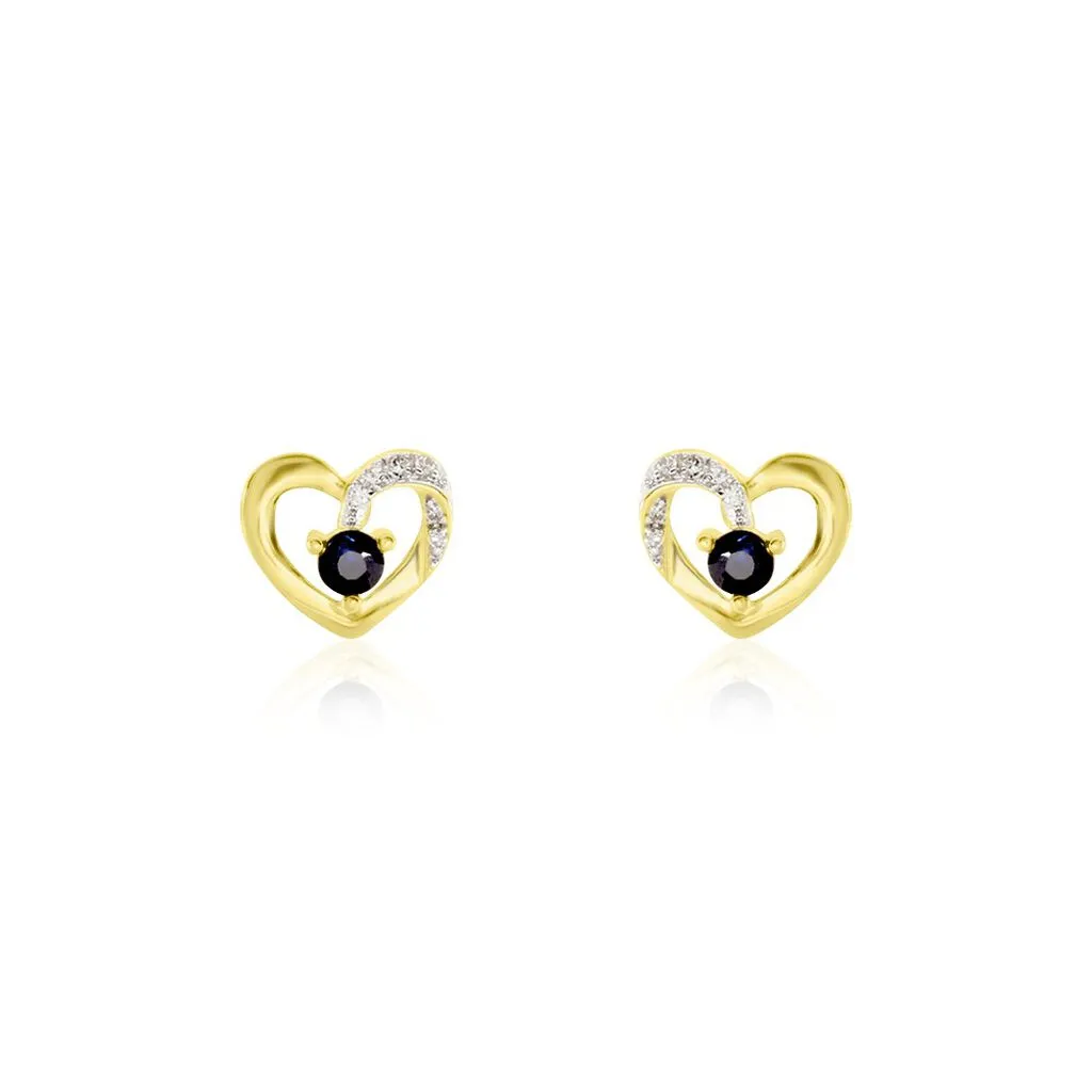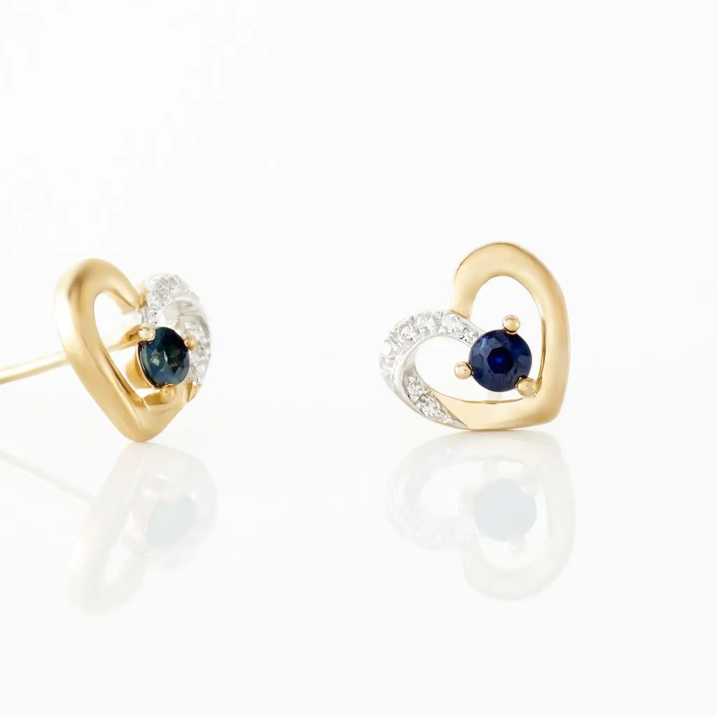 Boucles D’oreilles Puces Or Jaune 375/1000 Cœur Saphir Bleu Griffes Diamants