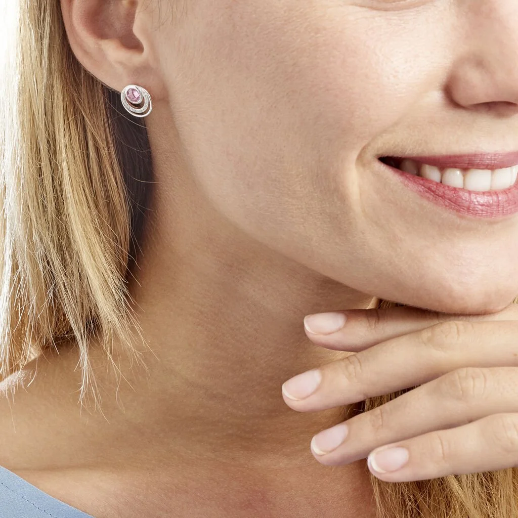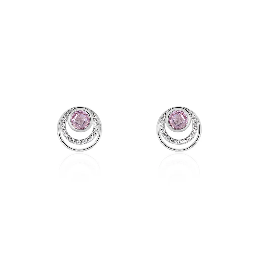 Boucles D’oreilles Argent Blanc 925/1000 Multicercles Micro Setting Oxydes De Zirconium Et Oxyde Facettes Rose Central