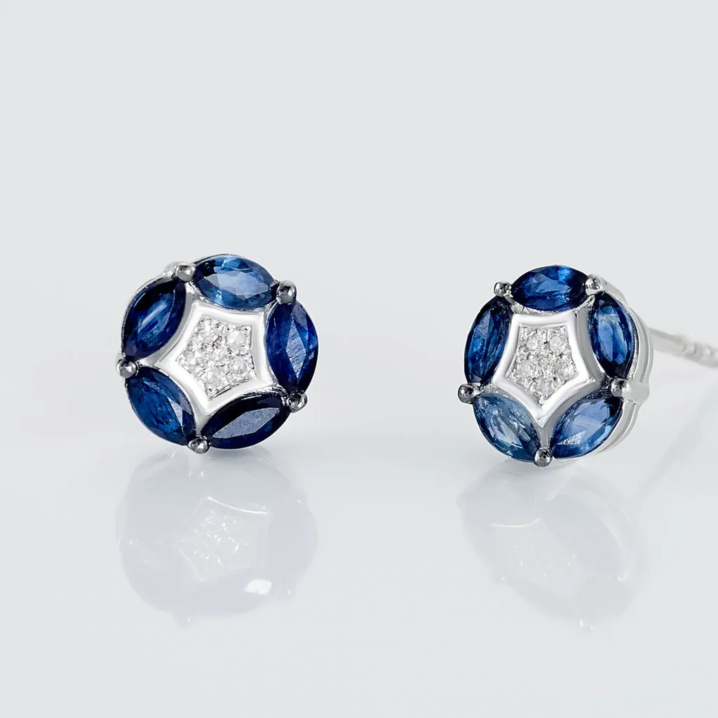Boucles D’oreilles Or Blanc 375/1000 Puces Formes Fleurs Saphirs Navettes + Pavage Central Diamants