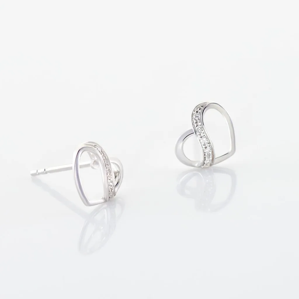 Boucles D’oreilles Or Blanc 375/1000 Puces Forme Cœur Ruban De Diamants Pavage Diamants