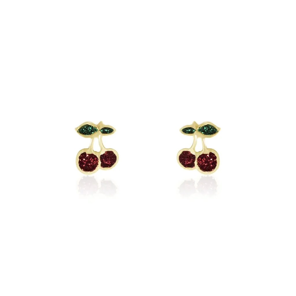 Boucles D’oreilles Puces Or Jaune 375/1000 Cerise Glitter Rouge