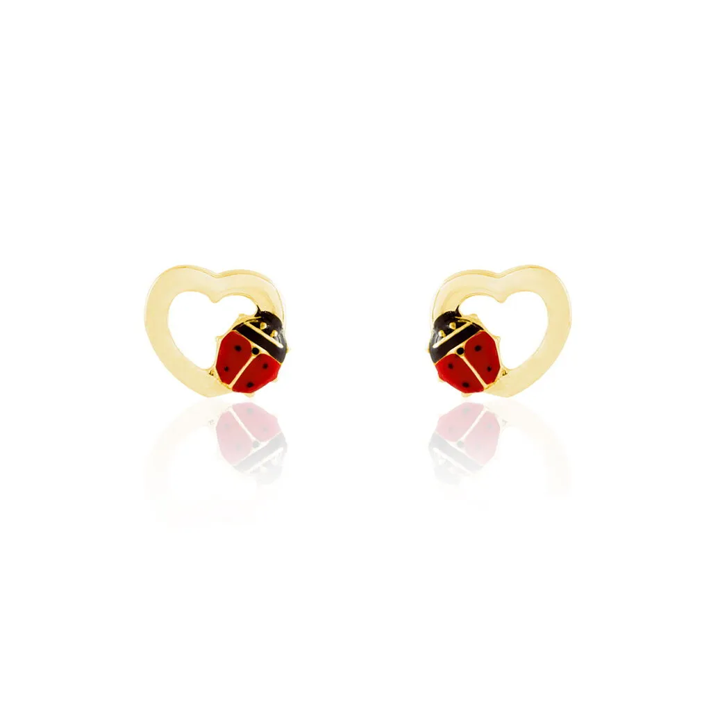 Boucles D’oreilles Puces Or Jaune 375/1000 Coeurs Et Coccinelles Smalto Rouge