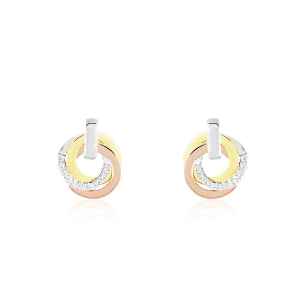 Boucles D’oreilles Puces Or Tricolore 375/1000 Forme Cercles Entrelaces Pavage Diamants