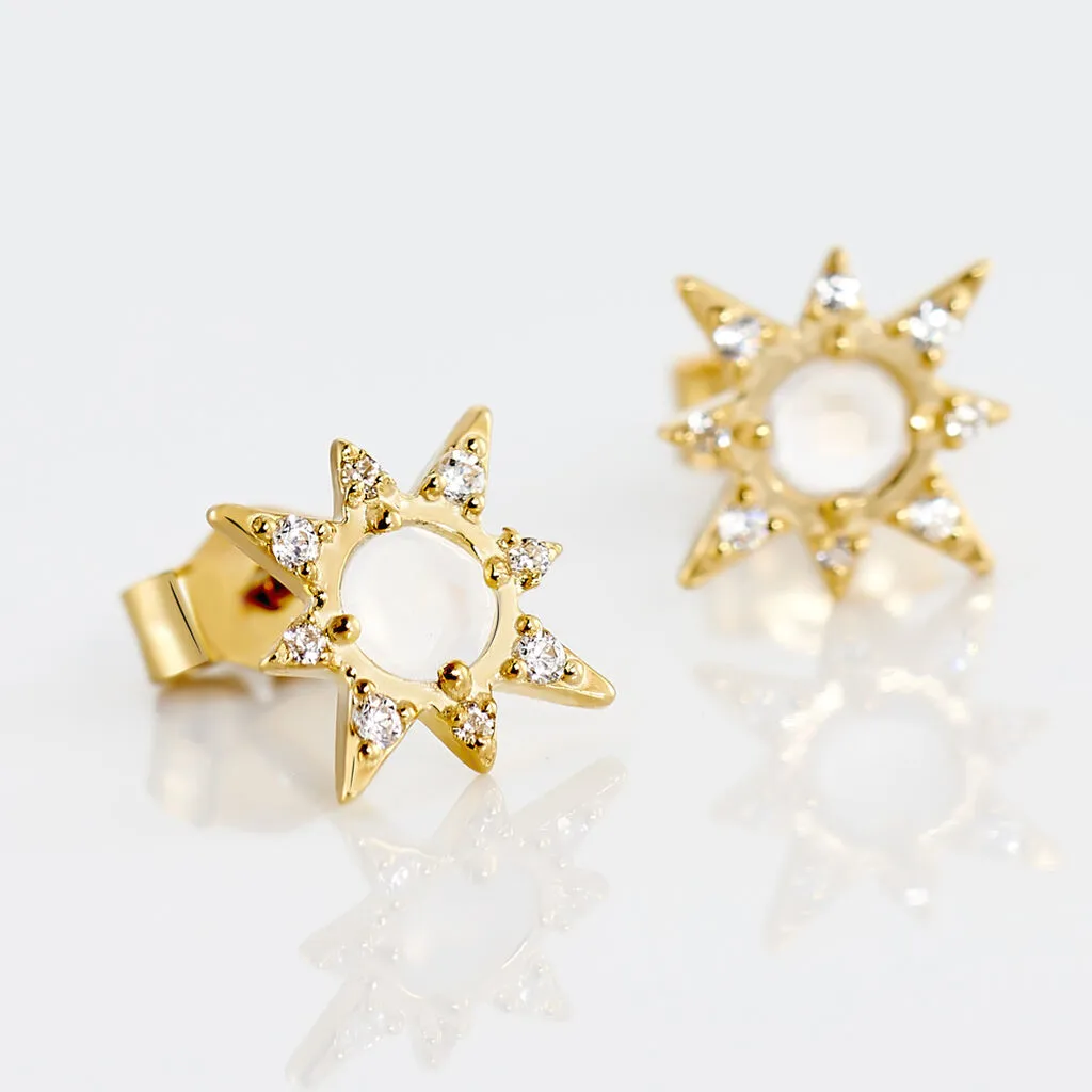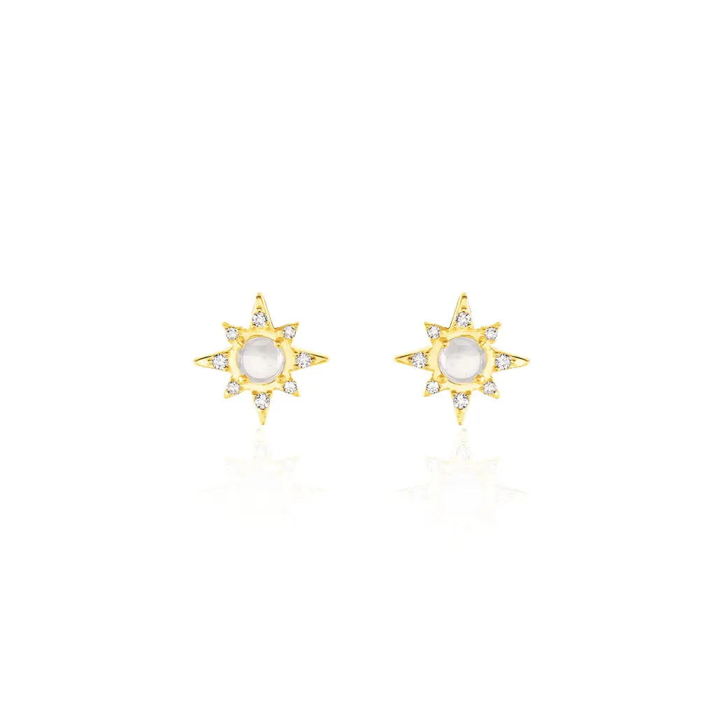 Boucles D’oreilles Or Jaune 375/1000 Puces Motif Etoile Calcédoine Bleue + Pavage Oxydes De Zirconium