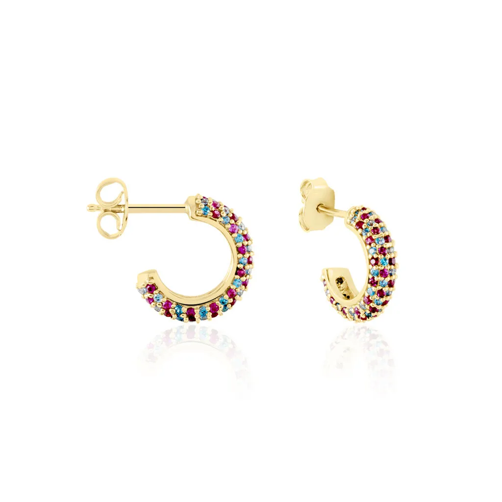 Créoles Plaqué Or Jaune Pavage Topazes Bleues Et Oxydes De Zirconium Rouges Diamètre 14mm